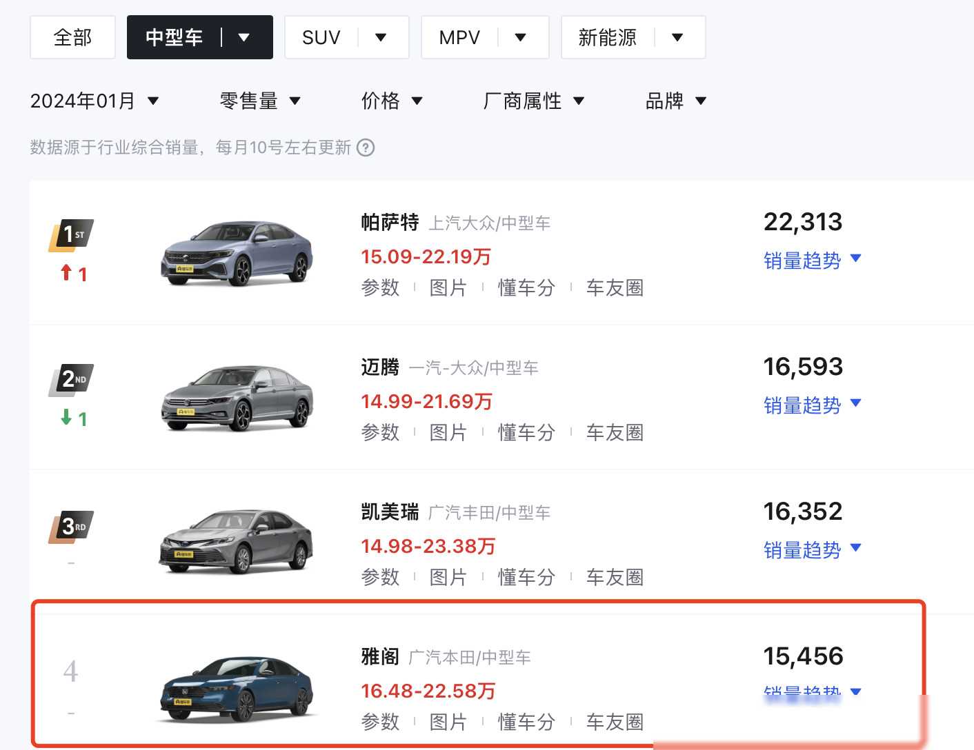 近期,車市上掀起了一股不小的波瀾,而這場風波的中心,正是備受矚目的新款雅閣。這款車自2024年1月面市以來,便以其驚人的銷量成績,在中型車市場占據了一席之地。據統計,新款雅閣在短短時間內便創下了15456臺的銷量佳績,勇奪中型車銷量榜單的第四名。而去年12月,它更是以超2.2萬臺的銷量,證明了其市場認可度的堅實基礎。
