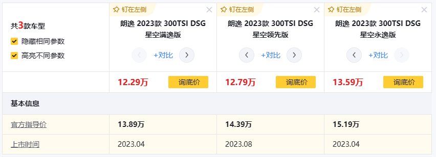8月4日,玩車弟從上汽大眾品牌官方處獲悉,旗下朗逸車型新增了一款名為300TSI星空領(lǐng)先版的配置版本,售價(jià)為14.39萬(wàn)元。參考現(xiàn)款車型配置來(lái)看,新版本車型定位于售價(jià)13.89萬(wàn)的星空滿逸版和售價(jià)15.19萬(wàn)的星空永逸版之間,屬于次頂配車型。
