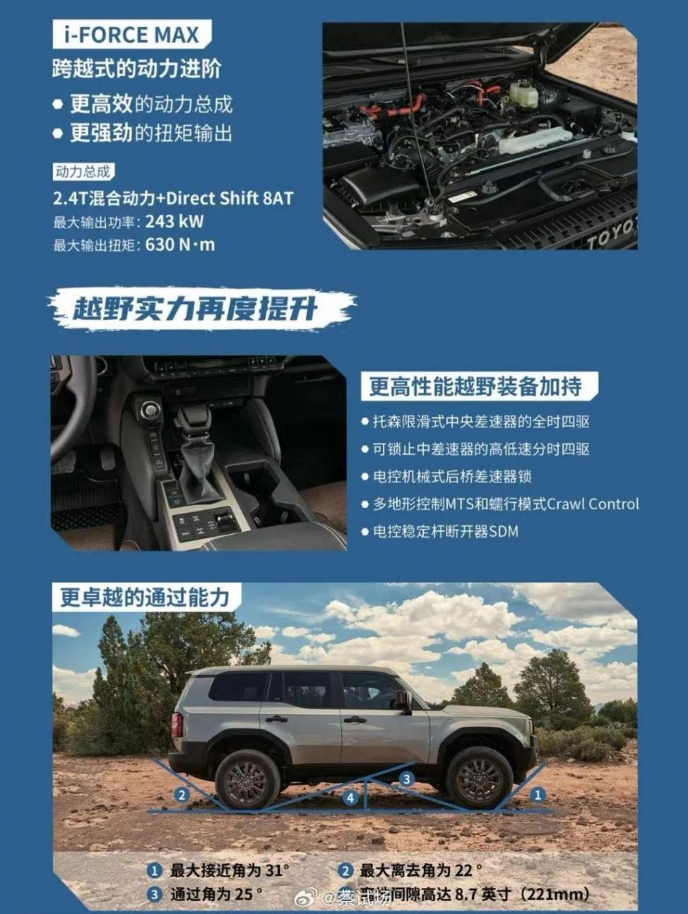 動力方面,正如此前傳聞的一樣,中國市場的普拉多將搭載該車系中最高規格的2.4T i-FORCE MAX混動系統,其中發動機是一臺縱置2.4T四缸汽油機,搭配8AT變速箱以及集成在變速箱內部的驅動電機,綜合功率330馬力,峰值扭矩630N·m,性能比上代的3.5L/4.0L V6自吸發動機大幅提升。在四驅方面,新車將搭載基于托森差速器的全時四驅系統,并提供中/后差速鎖以及SDM電控穩定桿斷開系統。