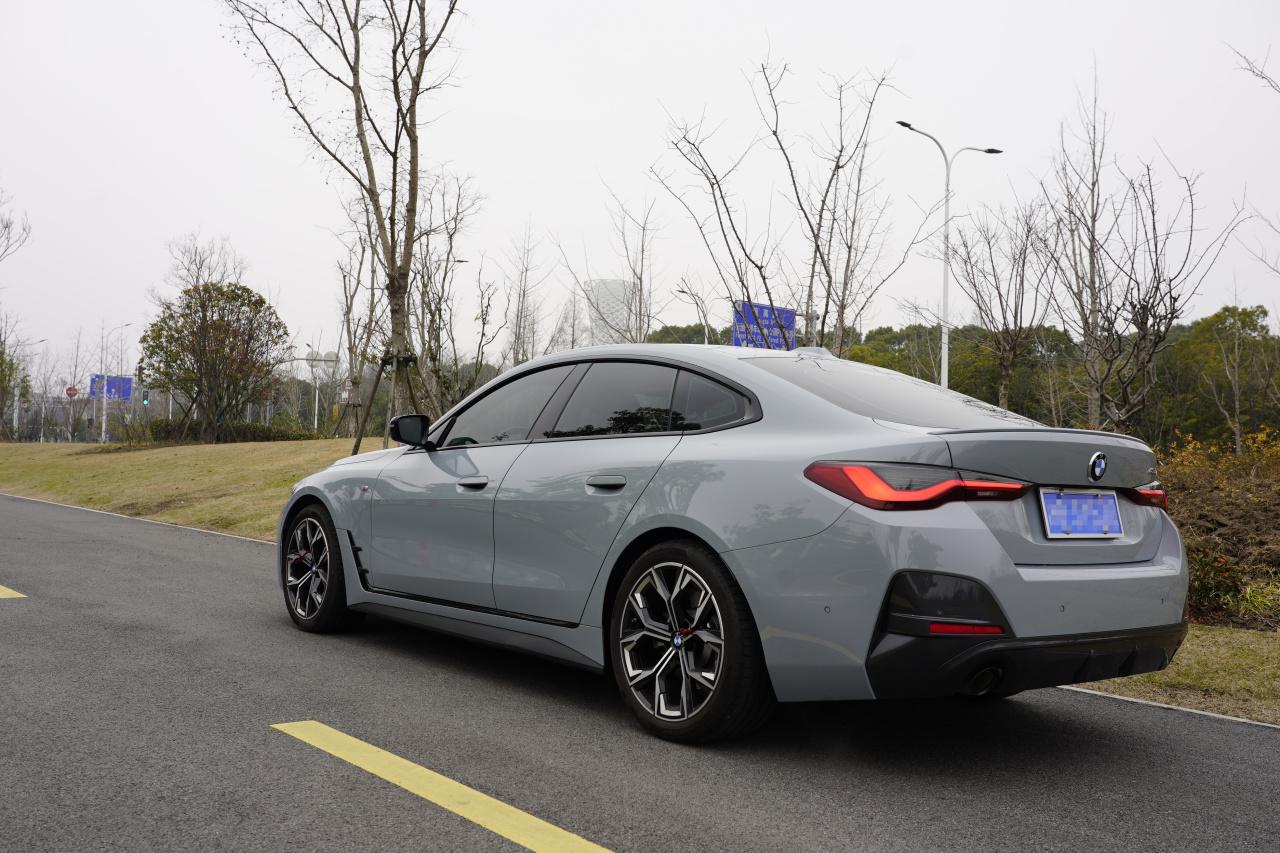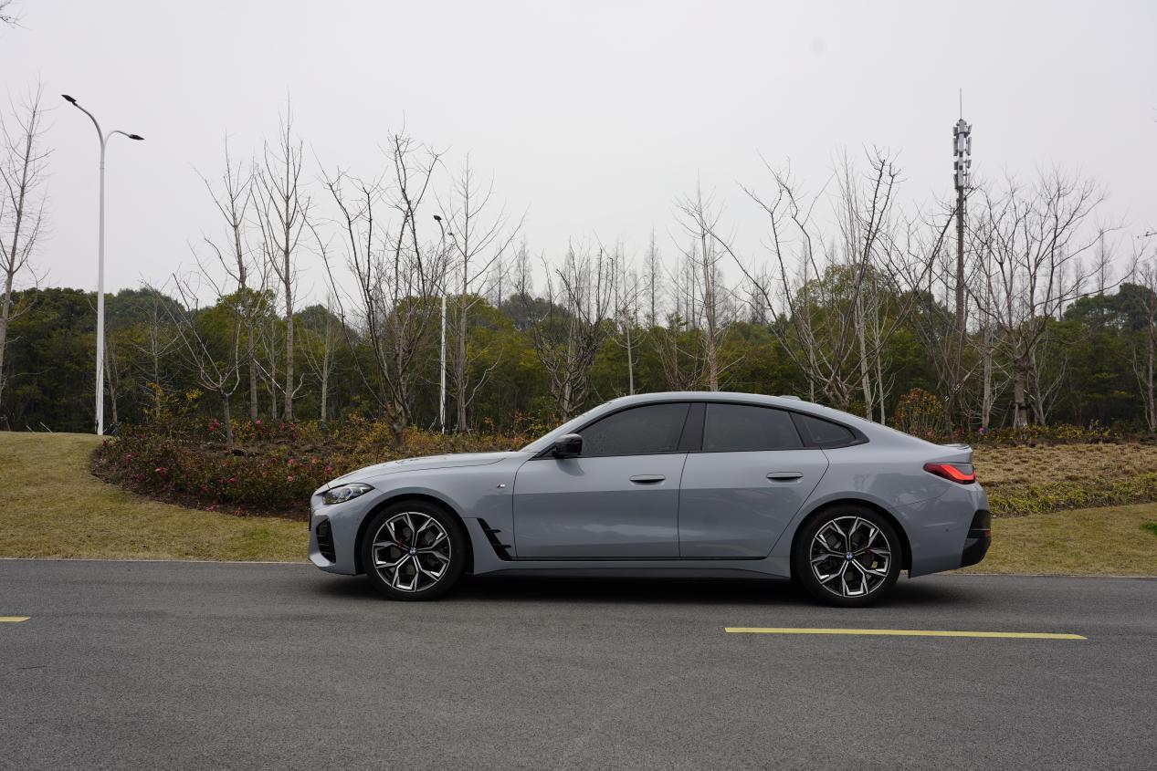 作為一款轎跑車,4系的側(cè)面一定是優(yōu)美的,哪怕這是款4門轎跑。我們可以看到4系有著非常標(biāo)準(zhǔn)的后驅(qū)車姿態(tài),短前懸,長車頭,L113區(qū)域,甚至它發(fā)動(dòng)機(jī)的位置大部分已經(jīng)居于前軸后了,是一款名副其實(shí)的發(fā)動(dòng)機(jī)前中置布局后驅(qū)車型。熟悉寶馬的朋友都知道這么做是為了什么——對,就是極致的50:50前后配重比,為了實(shí)現(xiàn)這一目標(biāo),寶馬甚至把4系的電池組放在了后備箱位置。