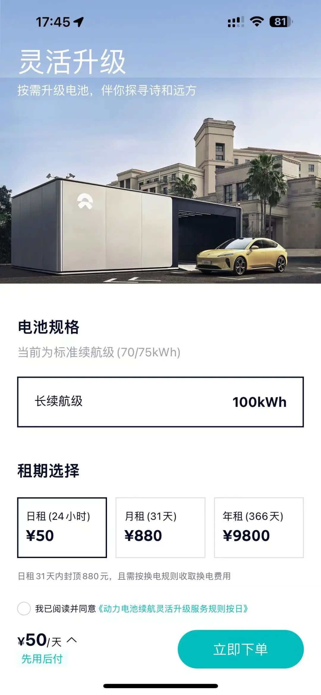 這其中的原因就在于換電模式帶來的電池更換便利,在2023年蔚來推出了電池按日靈活升級,75度電池的車主自駕游之前臨時換上100度電池,每天只需要花50元租金。一般人每年自駕游也就是10多天,花上幾百塊就可以實(shí)現(xiàn)大電池出游,既省錢又不浪費(fèi)地球資源。