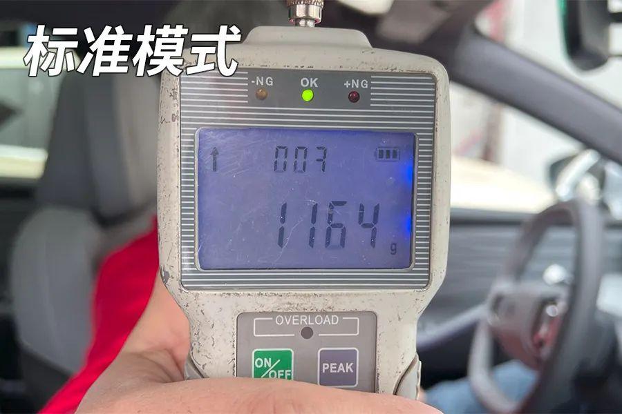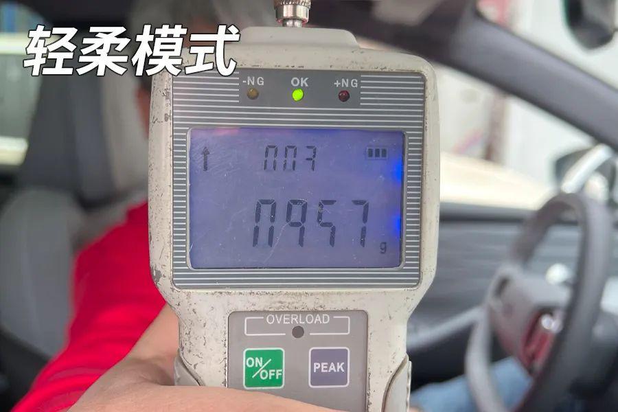 這輛車的轉向模式有三種,標準、輕柔和穩重。標準模式下,方向盤轉向力為1.164公斤;在輕柔模式下,方向盤轉向力為0.957公斤;在穩重模式下,方向盤轉向力為1.295公斤。方向盤力度相當輕松,低速轉向和停車入位比較方便。