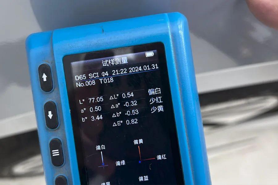 測試方法:使用色差計在引擎蓋中央位置取基準數值。在車身其它位置進行對比測量,記錄數值最大的位置。車身測試采樣點不小于100個。