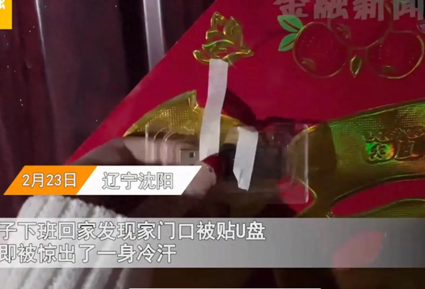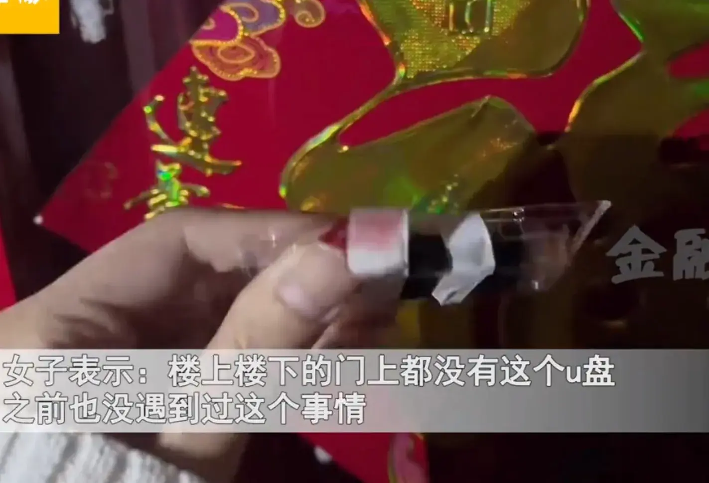 根據(jù)女子的描述,自己看到自家房門上竟然被人用膠帶粘了一個(gè)U盤(pán)!