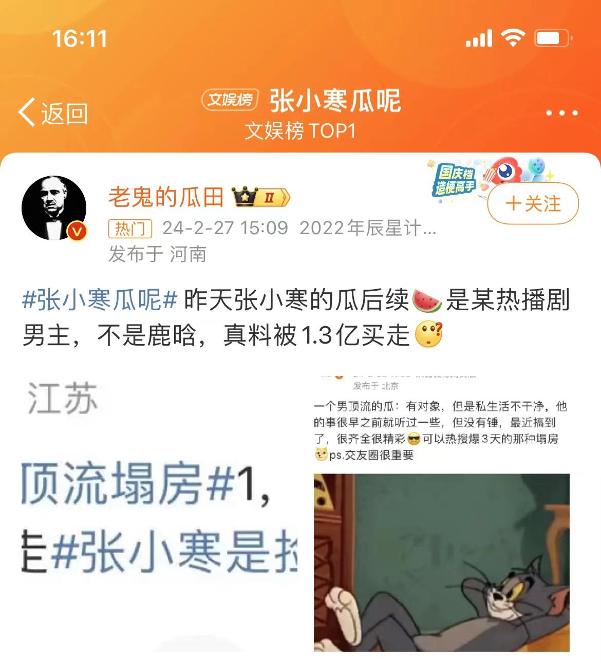 2月24日,狗仔吃瓜少女張小寒在微博發布:一個難頂流的瓜:有對象,但是私生活不干凈,他的事很早之前就聽過一些,但沒有錘,最近搞到了,很齊全很精彩,可以熱搜爆3天的那種塌方。雖然很多網友在吐槽現在的狗仔總是爆假消息,但是也不影響這條微博上熱搜,網友各種猜測,粉絲各種打架。