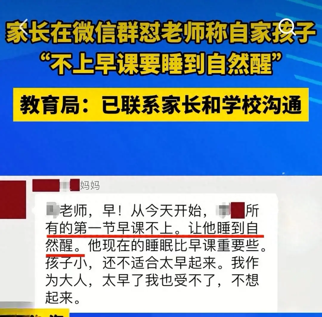 上海一家長在家長群里懟老師,大意為:從今天開始,自己孩子所有的第一節早課都不上,要讓他睡到自然醒。孩子的睡眠比早課更重要,自己作為大人都起不來。