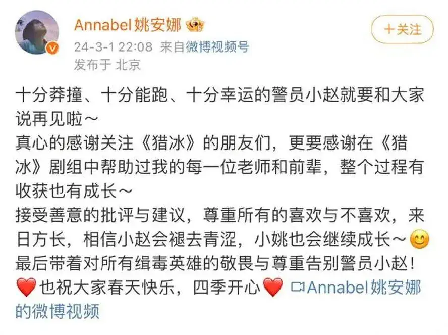 姚安娜首先向《獵冰》的觀眾和支持者們表達了深深的感激之情,她的話語如同細雨滋潤,讓每一個支持她的人感到被珍視。她特別提到了在拍攝過程中,那些默默付出的劇組成員、悉心指導(dǎo)她的老師和前輩們,她的話語中充滿了敬意和感激。