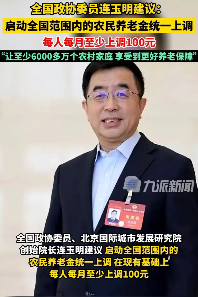 2.連玉明建議:?jiǎn)?dòng)全國(guó)范圍內(nèi)農(nóng)民養(yǎng)老金統(tǒng)一上調(diào),在現(xiàn)有基礎(chǔ)上,每人每月至少上調(diào)100元