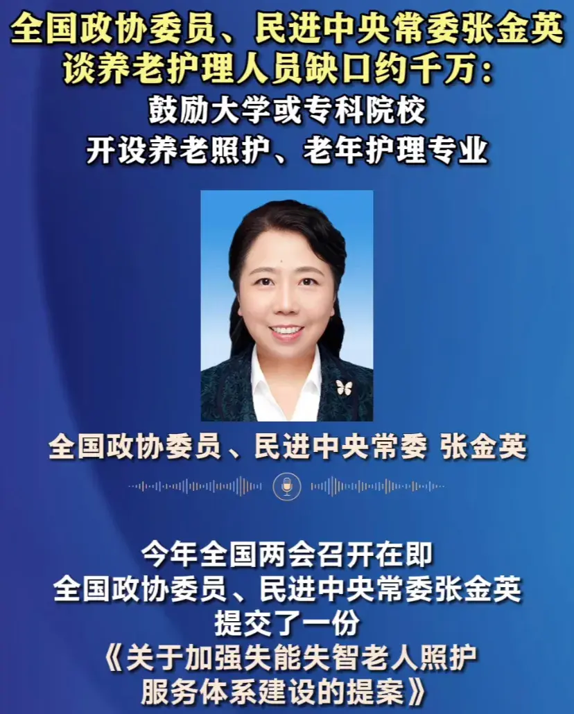 4.張金英:養(yǎng)老護(hù)理人才缺口約千萬(wàn),鼓勵(lì)大學(xué)或?qū)?圃盒i_(kāi)設(shè)老年護(hù)理、養(yǎng)老照護(hù)專(zhuān)業(yè)