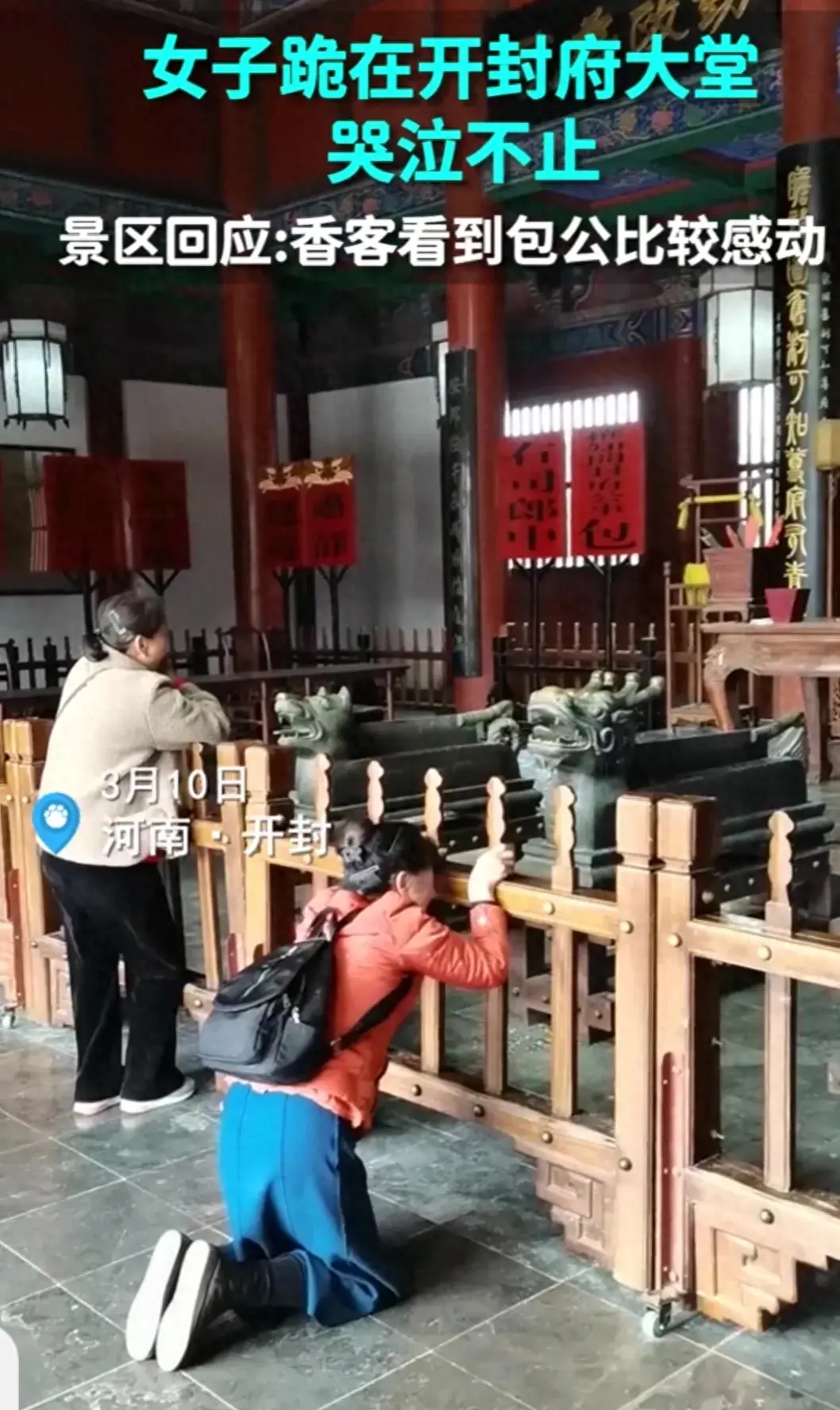 作為開封府大堂的管理者,我們對這位女子的行為表示理解和尊重。開封府大堂作為中國歷史文化的重要遺址,承載著包公文化的價值與精神。包公是我國歷史上一位仁義勇毅的法官,他的故事深入人心,代表了正義和公平。當游客在這里感受到包公的偉大品質時,激發出的情感是可以理解的。