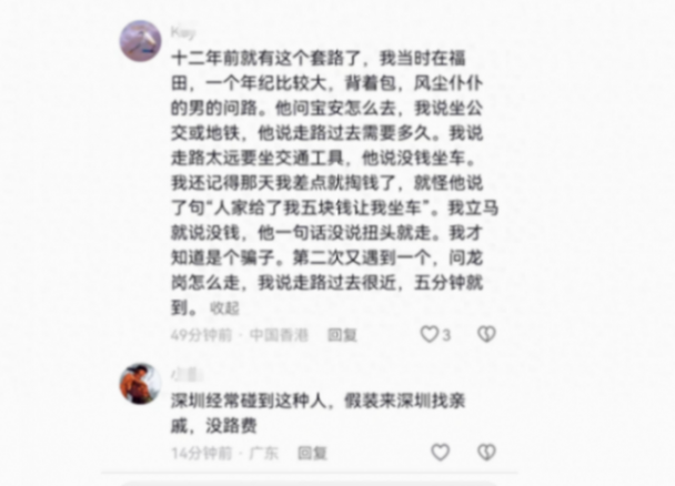 十二年前就有這個套路,我當時在福田,一個年紀比較大,背著包風塵仆仆問路。他問寶安怎么去,我說坐公交或地鐵,他說走路過去需要多久。