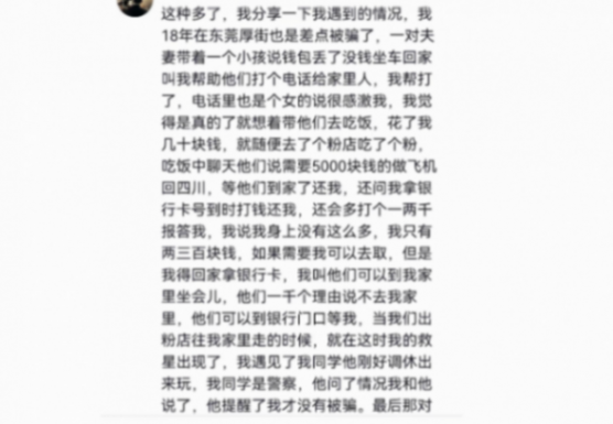 網友小北分享個人遭遇,18年在東莞厚街也是差點被騙了,一對夫妻帶著一個小孩說錢包丟了沒錢坐車回家叫我幫助他們打個電話給家里人,我幫打了,電話里也是個女的說很感激我,我覺得是真的了就想著帶他們去吃飯,花了我幾十塊錢,就隨便去了個粉店吃了個粉。