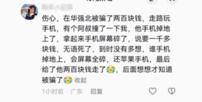 騙子花樣五花八門,還有專門盯著玩手機的人,通過碰瓷,將手機掉地上,然后找人索賠,本身即是壞手機,很多時候都會選擇花錢息事寧人。