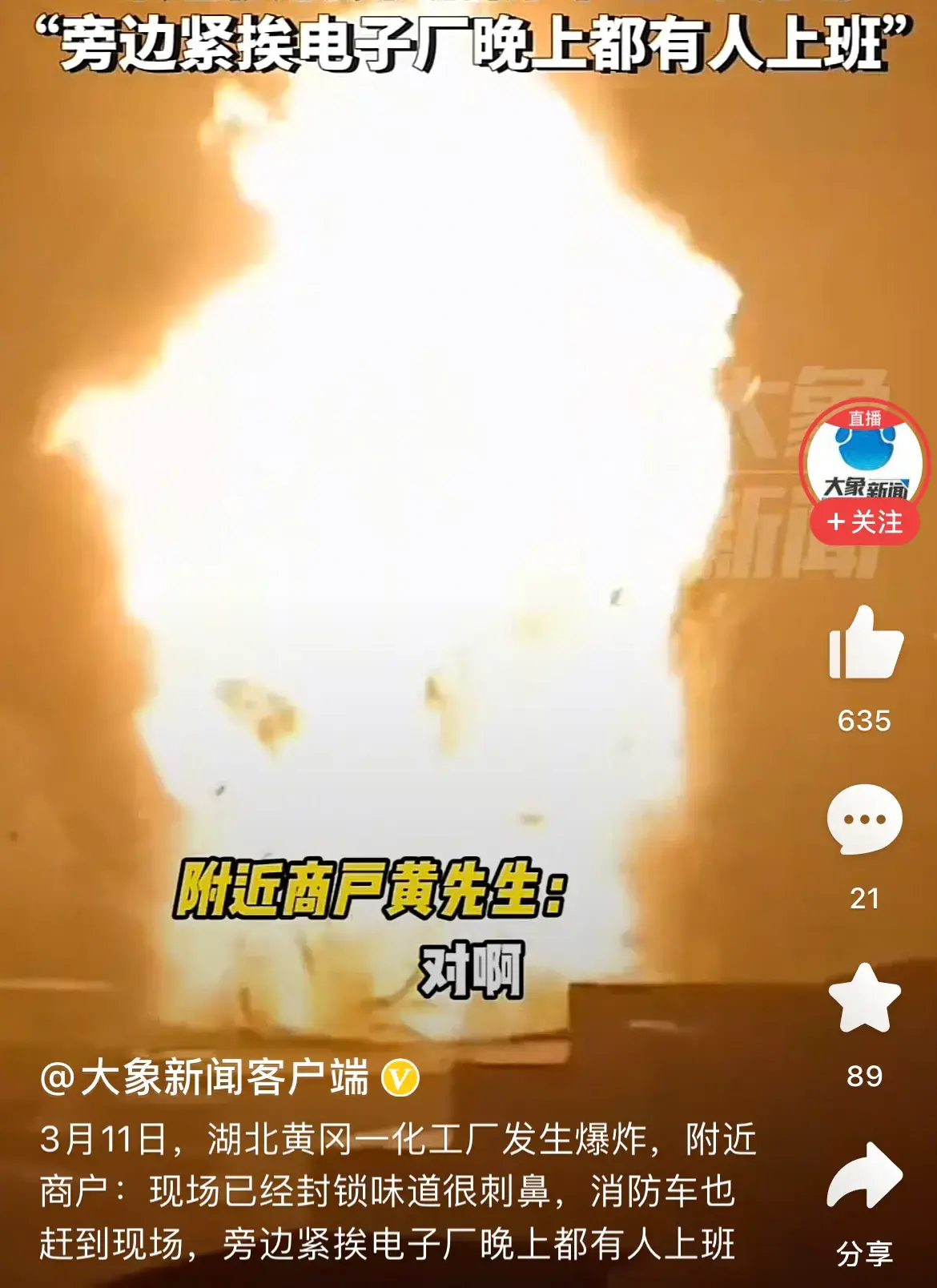 新聞報道,昨日晚間七點半,湖北黃岡的一個化工廠發(fā)生了接連四五次的爆炸,現(xiàn)場有毒烈的刺鼻化學品味道,消防車迅速趕到并在第一時間參與救火。