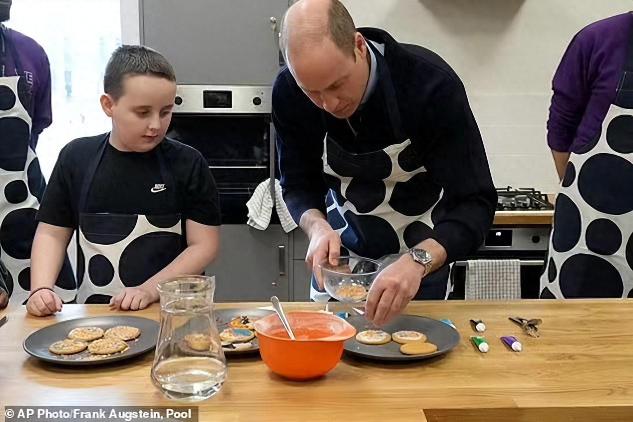 一會兒威廉進廚房和孩子們一起做餅干,并對餅干進行裝飾。只見威廉穿戴上和孩子們一樣的奶牛斑點大圍裙,他折彎下高大的剩菜,低著頭仔細地拿著小勺子把玻璃碗里的面包粉、糖霜、巧克力放置于已經做好的奶油餅干上,他神情專注,動作小心,一邊做,一邊自嘲: