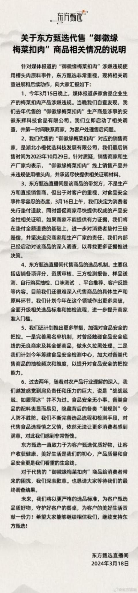 3月18日,東方甄選為代售“御徽緣梅菜扣肉”致歉,并表示將墊付全額退費,如商家不能提供有力證據,將墊付三倍賠償。