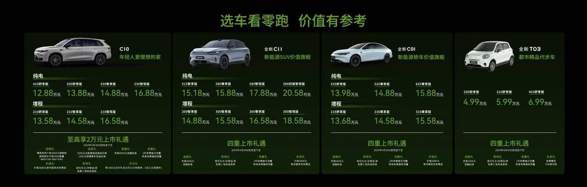 零跑C10暨24年新品全家桶煥新發(fā)布正式上市,共推出7款車型, 4款純電車型價(jià)格區(qū)間12.88-16.88萬(wàn)元,3款增程車型價(jià)格區(qū)間13.58-16.58萬(wàn)元,其中,純電版本最大電池容量69.9kWh,CLTC續(xù)航最高可達(dá)530km;增程版本最大電池容量28.4kWh,CLTC純電續(xù)航最高可達(dá)210km,CLTC綜合續(xù)航最高可達(dá)1190km。
