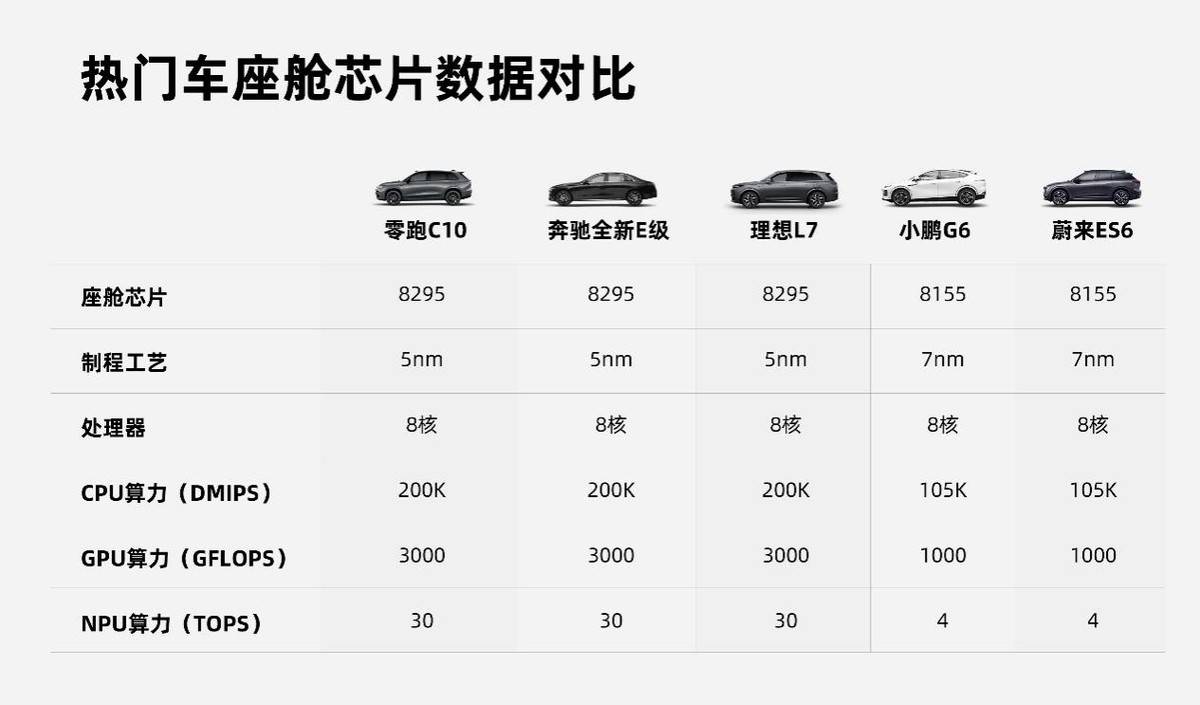 零跑C10搭載高通驍龍的第四代座艙平臺(tái),其8295芯片采用5nm制程工藝,NPU算力達(dá)到30 TOPS,為當(dāng)前主流8155P的7.5倍;第六代高通®Kryo™ CPU算力達(dá)到200K DMIPS,主要計(jì)算單元的能力相對(duì)于8155提升50%以上;高通®Adreno™ GPU算力達(dá)到3000 GFLOPS,相比8155提升300%。