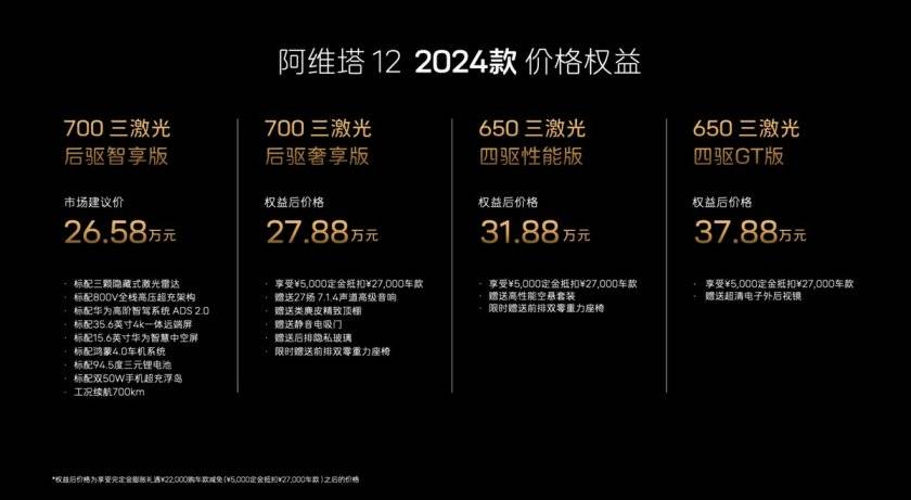 3月29日,阿維塔12 2024款煥新上市。新車共推出4款車型,價格區間為26.58萬元-40.08萬元,享配置翻倍、權益翻倍。煥新產品以頂奢豪華、頂級智能、頂尖安全的三大核心優勢的躍升進化,重新定義新時代豪華車標準。阿維塔12 新推出 700三激光后驅智享版,標配華為ADS 2.0、800V高壓超充等,讓其成為了全球“智駕比”最高的中大型新能源豪華轎車。