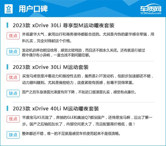 在用戶口碑中,多數消費者對2023款華晨寶馬X5的設計、空間以及動力表示滿意。不過,也有車主認為該車國產之后漆面光澤度有所下降,車機系統流暢度一般,有待優化。此外,行駛過程中偶有異響,也令車主有些煩惱。