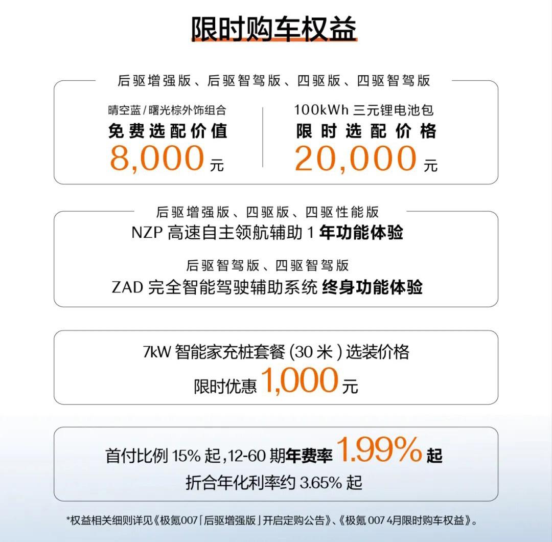 購買極氪007車型的用戶將享有豐富權益,如整車6年或15萬公里質保、三電系統終身質保、終身免費數據流量服務、質保期內免費道路救援等。值得關注的是,在4月30日24:00前,通過極氪App向官方合作金融機構申請分期購車的客戶,還有機會享受限時低息優惠方案。