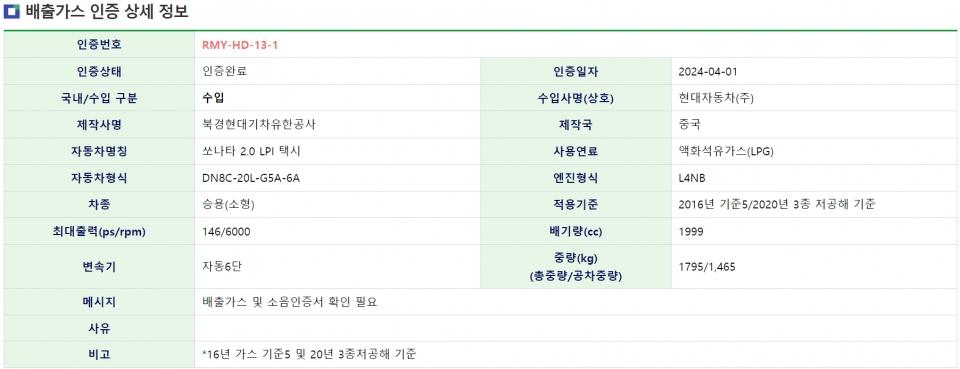 據韓國 國立環境科學院 交通環境研究所 汽車尾氣排放及噪音認證系統(KENCIS)透露,現代汽車昨天(1日)獲得了索納塔2.0 LPi出租車車型的認證。