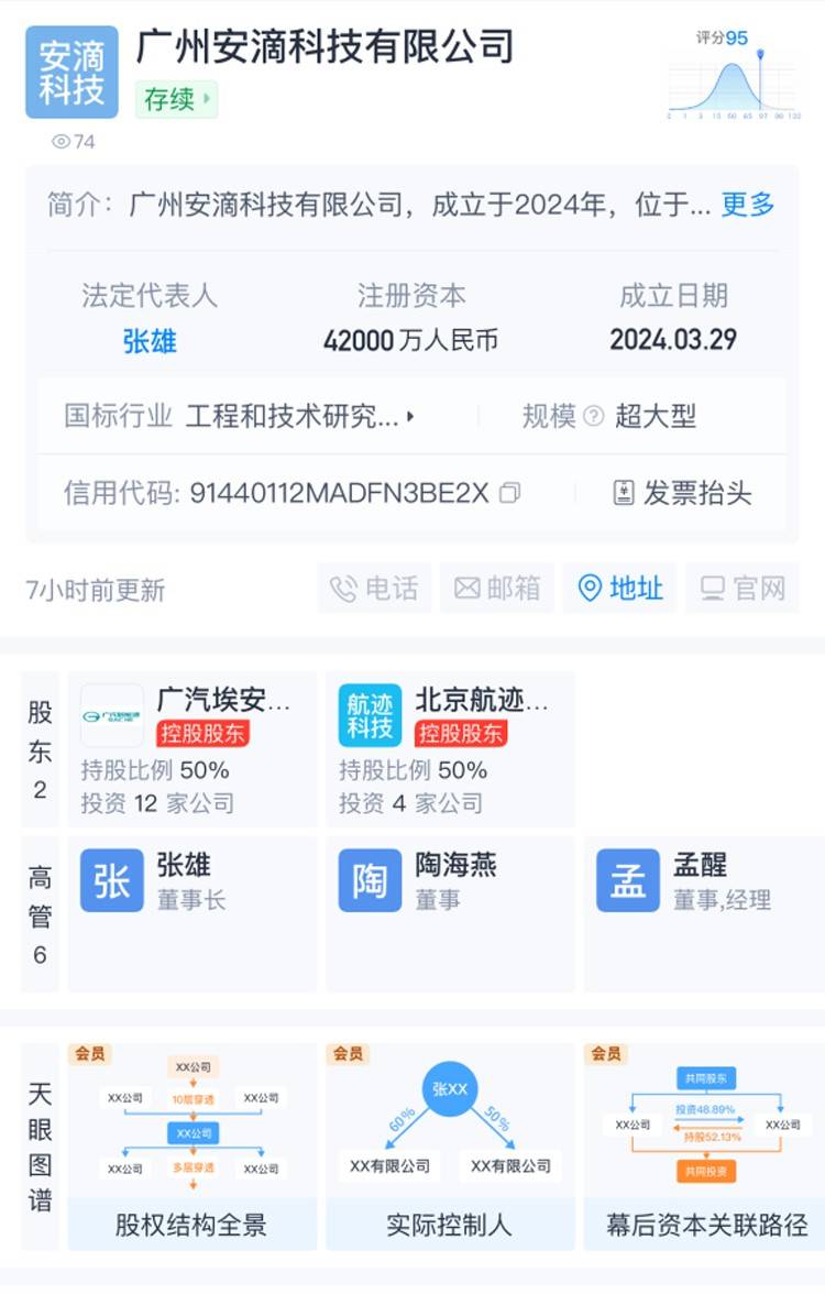 安滴科技有限公司注冊(cè)資本4.2億元,總部位于廣州黃埔,其中,廣汽埃安持股50%,北京航跡科技持股50%(滴滴關(guān)聯(lián)公司),董事長(zhǎng)由廣汽埃安副總經(jīng)理張雄擔(dān)任,總經(jīng)理由滴滴自動(dòng)駕駛COO孟醒擔(dān)任。