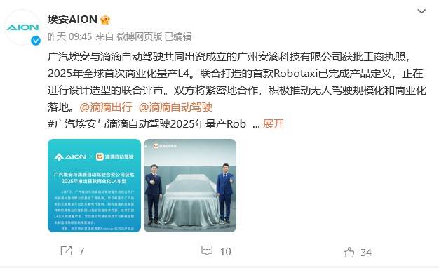 廣汽埃安和滴滴合作由來(lái)已久,2021年5月17日,滴滴自動(dòng)駕駛曾宣布與廣汽埃安達(dá)成戰(zhàn)略合作,雙方將合作開發(fā)出一款能夠量產(chǎn)的無(wú)人駕駛新能源車型,月底,滴滴自動(dòng)駕駛獲廣汽集團(tuán)戰(zhàn)略投資,投資金額超3億美元。