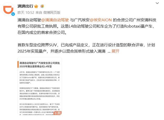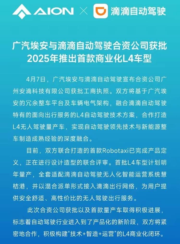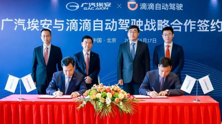 2023年5月,滴滴自動(dòng)駕駛公司與廣汽埃安新能源汽車股份有限公司簽訂深化合作協(xié)議,共同發(fā)布無(wú)人駕駛新能源量產(chǎn)車項(xiàng)目——“AIDI計(jì)劃”,并宣布將成立合資公司。