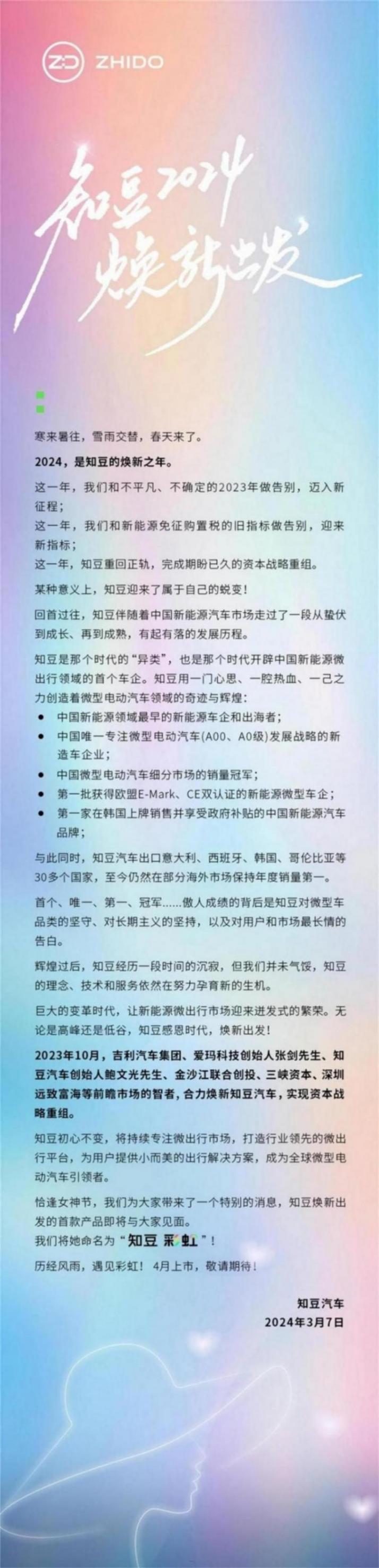 4月18日,煥新后的知豆汽車(chē)將正式推出(上市)首款車(chē)型——知豆彩虹。