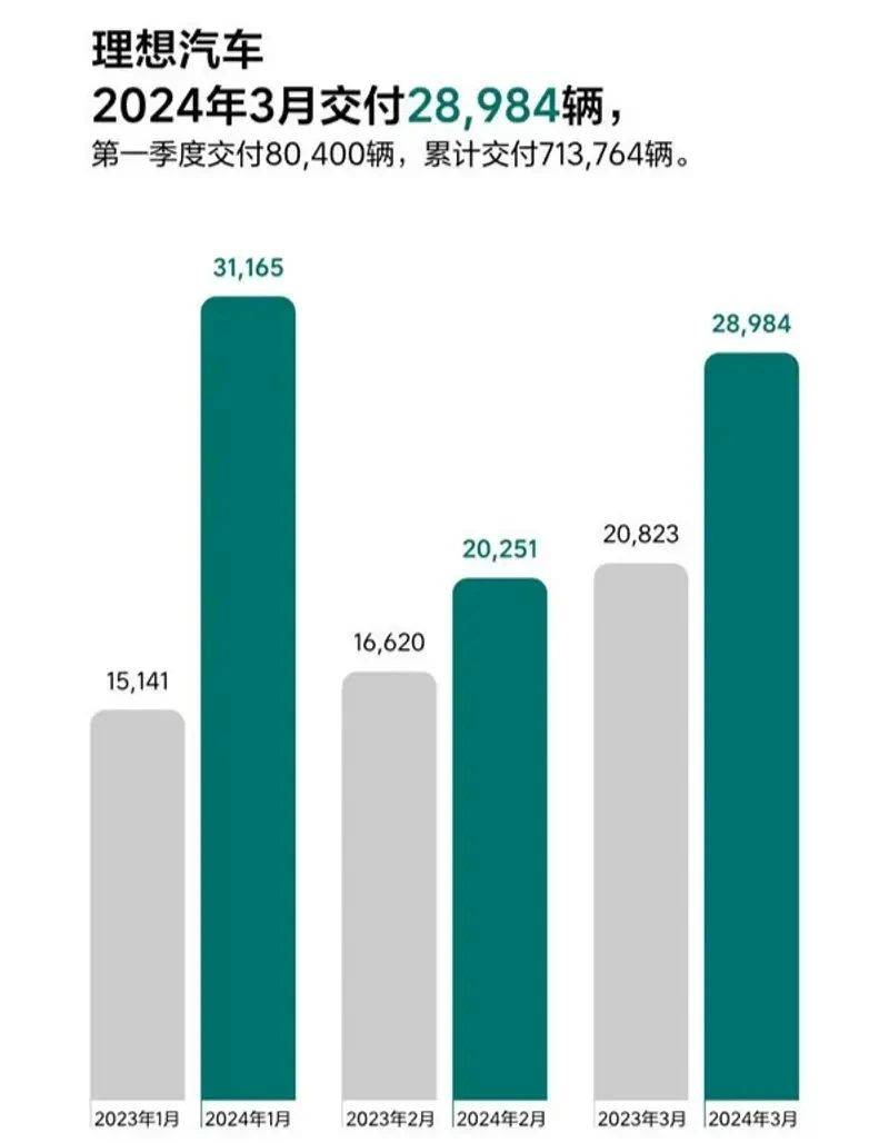雖然MEGA出師不利,但理想在3月份也交出了不俗的成績單,共交付新車28984輛,同比增長39.2%,環比增長43.12%。截至3月31日,理想汽車累計交付量已達71.38萬輛,成為首家達成累計交付70萬輛的中國新勢力車企。
