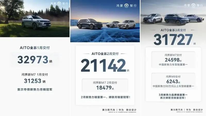得益于遙遙領先的產品力,華為鴻蒙智行旗下AITO問界表現強勁,3月全系交付新車31727輛,銷量再次超越理想汽車,連續三個月奪得中國新勢力品牌銷量冠軍。