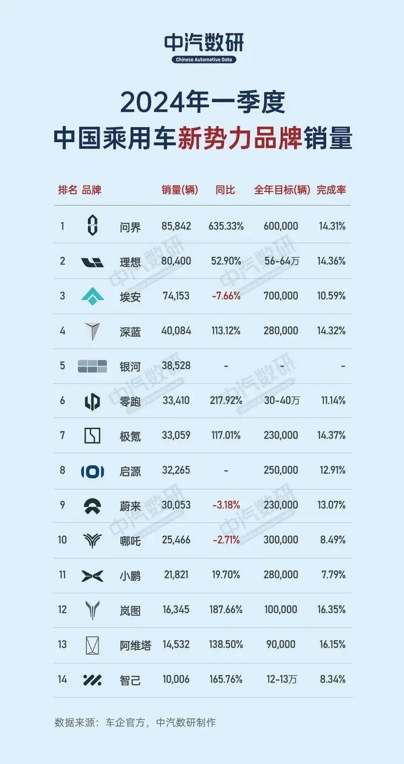 今年由于比亞迪的強勢攪局,使得2024開年就陷入了瘋狂價格戰,一季度各大車企都是在跟進降價搶市場的節奏,瘋狂的價格戰也是更加考驗新能源車企體系力與技術研發能力,同時一季度的銷量也更能體現新勢力的綜合實力。