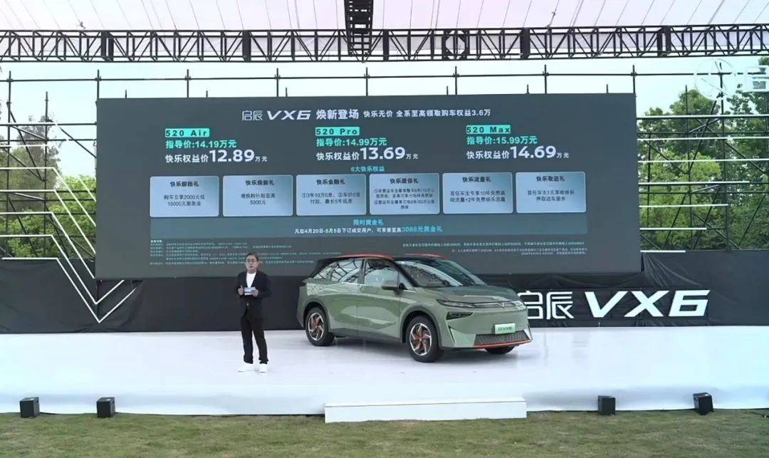 4月20日,新款啟辰VX6公布價格,共有3款車型,指導價區間為14.19萬-15.99萬元,而在疊加了“快樂權益”后,最終的價格區間為12.89萬-14.69萬元。