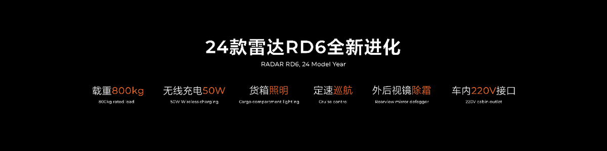 此外,24款雷達RD6也為用戶帶來了巨大驚喜,其載重能力由原來的450公斤增加到了800公斤,更加契合創客人群需要。駕乘舒適和便利性同時升級,車內新增了50w無線充電功能和220V接口,實現全車用電自由,并配置了定速巡航。外后視鏡也增加了除霜功能,環境適應性大大提高。同時,用戶呼聲很高的貨箱照明同樣出現在了24款雷達RD6上。這些升級讓24款雷達RD6成為創客的最佳搭檔,創業之路更加“多快好省”