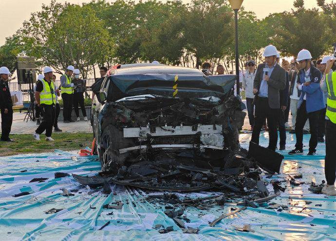 但是星紀元ET的這次墜落測試,也能夠證明一點東西。比如說車身結構足夠的堅固。車頭基本撞沒了,但是ABC柱是完整的,乘員艙也沒有變形。 而且隱藏式門把手自動彈出了,車門也可以正常開啟,這就為后續的救援提供了便利的條件。 說句通俗易懂的話,就是人依然會受很嚴重的內傷。但是能不能救得過來,就看醫務人員什么時候抵達事故現場,能不能及時的被送到醫院里去了。 所以我上面說嘛,90公里的時速你撞墻,就是看命,不看車。