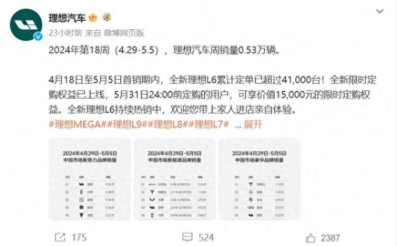 可以看出理想時隔近2個月,重新發布銷量周排行。并且文案中也提到了理想L6的熱銷。訂單量超過4.1萬臺,是一個非常不錯的成績。