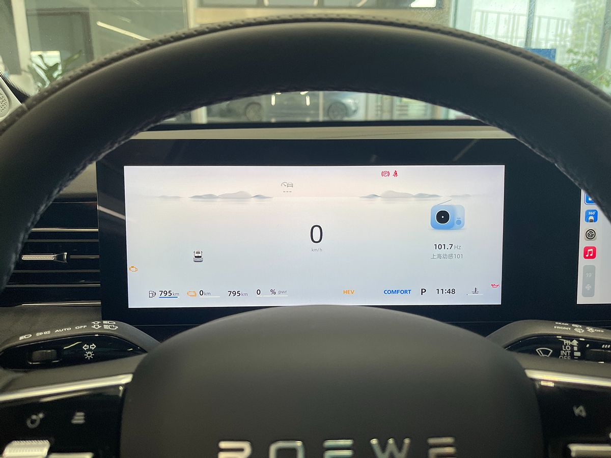 中控臺也和榮威eRX5基本一致,全液晶儀表盤和中控屏組成雙聯屏的形式,尺寸均為12.3英寸,是座艙科技感的主要來源。方向盤樣式有調整,為最新的家族風格,雙幅造型,全系都為皮革材質。空調出風口為一體式設計,還能看到翻毛皮等材質,精致感有所體現。