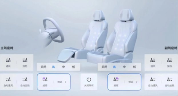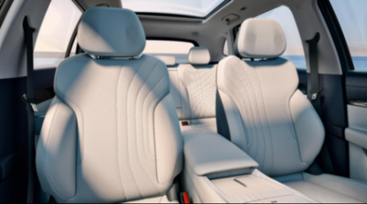 多功能方向盤采用雙色雙輻上下平底構造,扶手箱采用木紋飾板覆蓋,最前方是大顆旋鈕和四顆實體按鍵,后方為帶有蓋板的儲物格和手機無線充電面板,主流的電子懷擋換擋應該也不會落下。前排座椅支持加熱/通風/8點按摩,副駕駛帶有電動腿托,后排座椅支持靠背調節,還配備了16揚聲器WANOS音響系統、頭枕揚聲器、全景天窗等配置。