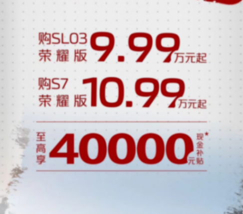 優惠力度更大的是榮耀版車型,可直接享受2萬元現金補貼,再加上報廢舊車置換補貼2萬元,共計可獲得4萬元現金補貼,最終SL03榮耀版售價9.99萬起,S7榮耀版10.99萬起,這還沒算上金融禮、保險禮等購車權益。看到這里,某個一年前花16萬購買深藍SL03的老車主,已經輕輕碎掉了。