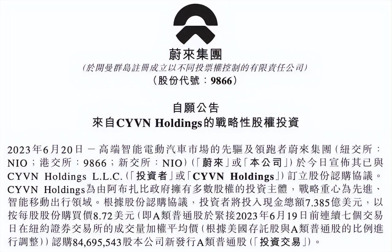 2023年7月,蔚來汽車宣布已完成阿布扎比投資機構CYVN Investments RSC Ltd的7.385億美元戰略股權投資。