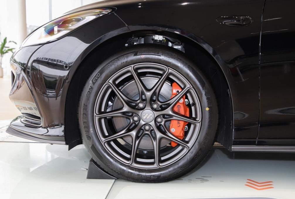 標配19英寸輪圈,磨砂黑細條輻有性能感,后方大尺寸橙色大陸牌剎車卡鉗很顯眼,還可選裝20英寸運動輪圈。輪胎規(guī)格為245/45 R19,匹配韓泰iON evo系列產(chǎn)品,有良好的干濕地抓地性和一定的靜音能力。