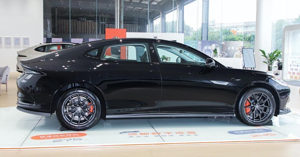 側(cè)面看,車身轎跑感鮮明,溜背的車頂十分順滑,配合上翹的車尾,運動感十足。前后懸基本等長,高度適中,份量感合適。起伏的腰線兩端低、中間高,有新鮮感。四個車門都是無框式,與整體風格匹配。這臺性能版車型底部增加立體的裙邊,讓車底氣流快速流出。采用整體隱藏彈出式門把手,標配全車無鑰匙進入,支持NFC和手機藍牙鑰匙。