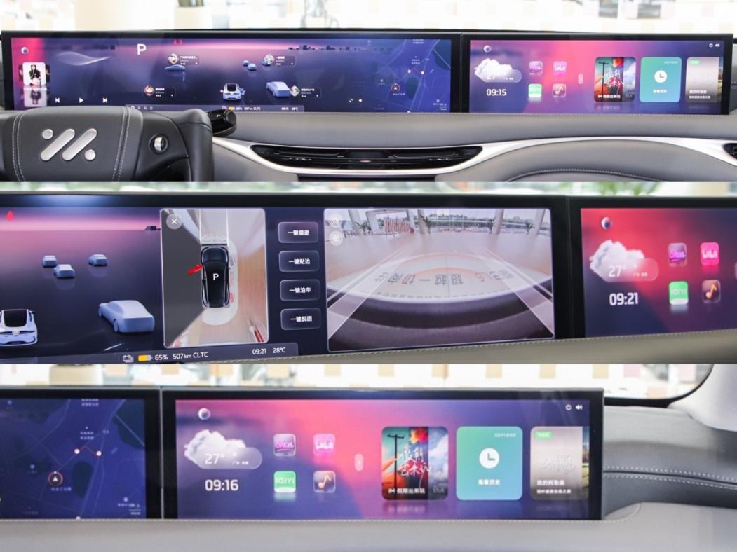 左側(cè)26.3英寸屏幕是整體屏,芯片升級為高通8295P,新車的電氣架構(gòu)升級為IMOS 3.0,座艙與智駕算力共享。車機的流暢度高,支持4音區(qū)識別、免喚醒詞和連續(xù)對話,達到可見即可說,還能用多指飛屏將主副屏信息打通。屏幕展示的信息從左到右分別是娛樂、行車環(huán)境、導航,還具備全域數(shù)字視野補盲功能,在打轉(zhuǎn)向燈時,兩側(cè)會彈出小窗口展示側(cè)后攝像頭的畫面,可消除外后視鏡的視野盲區(qū),提升了暗光環(huán)境的可見度,提升安全性。15.5英寸副駕屏在其他車型需要選裝。