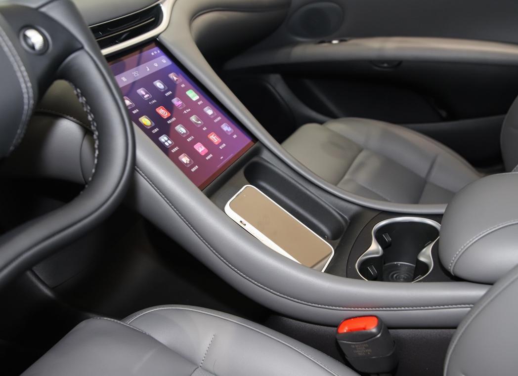 傾斜布置的10.5英寸觸控操作屏用來控制車輛硬件,集成化程度很高,距離手比較近,操作便利。屏幕下方手機位帶50W無線充電和通風散熱,右側(cè)是比較深的凹槽。底部是開放式雙杯架,扶手箱容積較大,下方雙通道也有一定儲物能力。