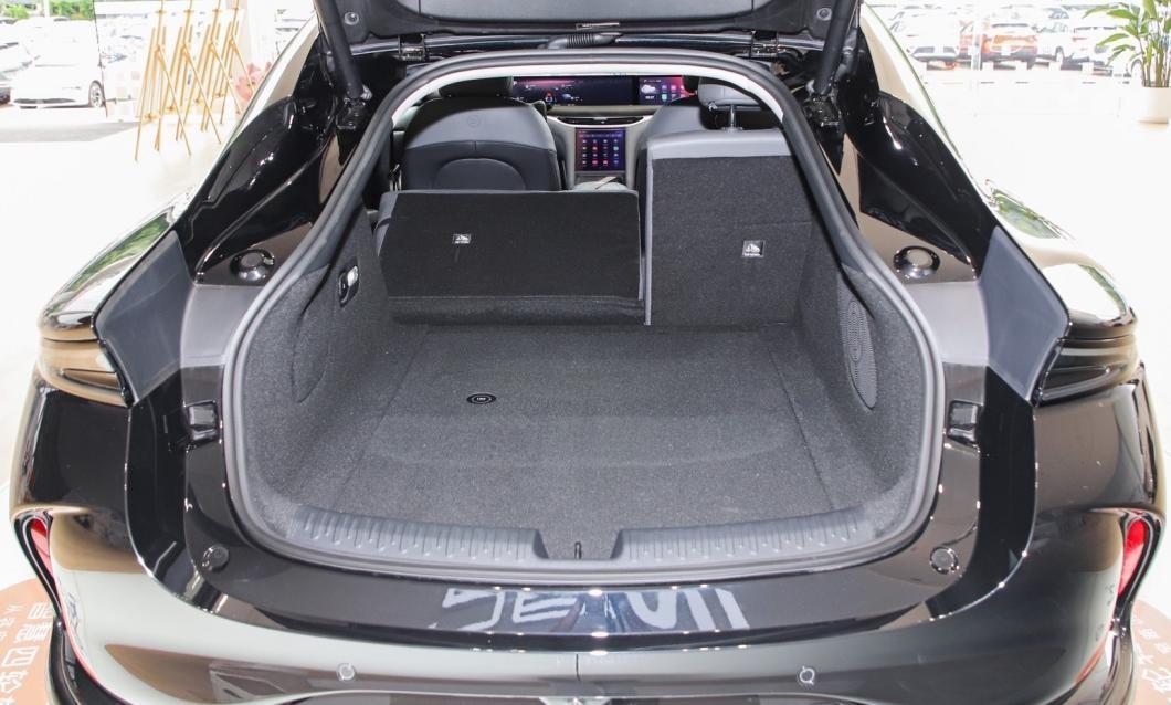 尾部同樣足夠?qū)挘下N的鴨尾造型夸張,底部保險杠的環(huán)繞感與車頭呼應,兩側(cè)集成反光片,比較巧妙。環(huán)形尾燈辨識度提升不少,中央集成了車外交互屏,可自定義內(nèi)容,增強與外界的互動性。