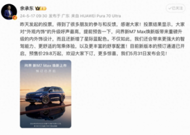 日前,我們從官方獲悉,問界M7 Max煥新版將于5月31日正式上市,新車現已開啟預訂,預售價29.8萬起,預訂可享1000元抵2000元購車款,截止至5月31日20:00整。據悉,新車將針對外觀和內飾均有不同程度的升級,同時還會對智駕能力、駕乘體驗和舒享配置進行升級。