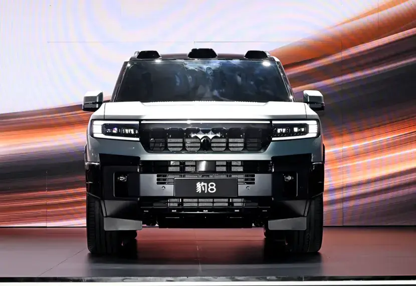 外觀方面,新車整體延續SUPER 8概念車的設計理念,采用方程豹全新設計語言,前臉方框狀6孔式前格柵,造型兇悍。格柵中間位置處加入方程豹LOGO,彰顯比亞迪高端越野SUV的身份。格柵上部加入貫穿式燈帶,連接兩側半方塊狀的大燈組,讓整體前臉形成倒“凸”字形,顯得十分的硬朗。