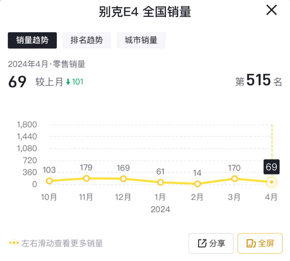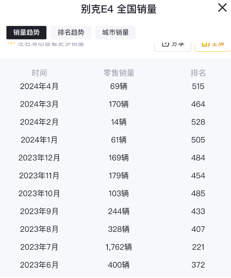 更讓人擔憂的是,從銷量規模上看,2024年4月份別克E4單月僅售69臺的銷量成績,也確實過于低了點。
