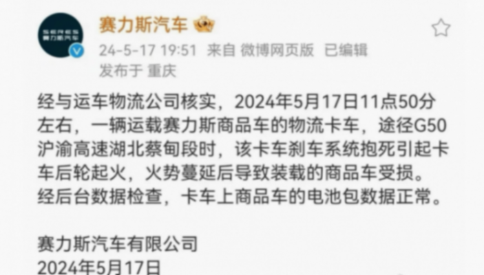 具體到賽力斯汽車,此前問界M7 PLUS不幸起火事件,官方也對事件及時進行了回應和說明。